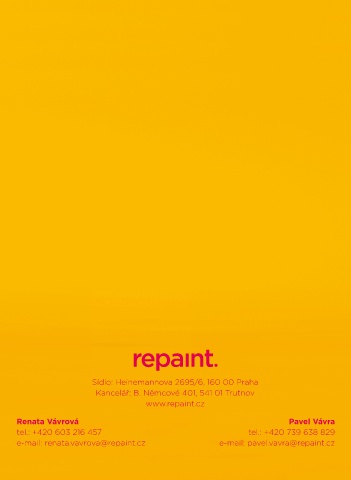 Sídlo: Heinemannova 2695/6, 160 00 Praha Kancelář: B. Němcové 401, 541 01 Trutnov www.repaint.cz Renata Vávrová Pavel Vávra tel.: +420 603 216 457 tel.: +420 739 638 829 e-mail: renata.vavrova@repaint.cz e-mail: pavel.vavra@repaint.cz