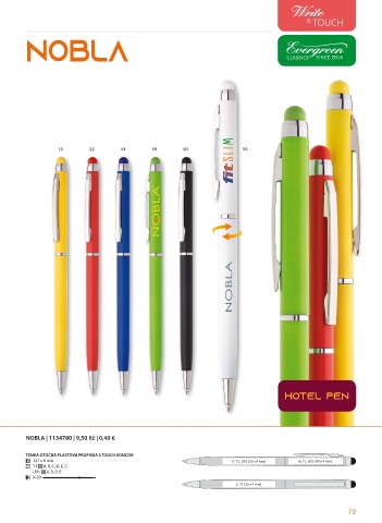 NOBLA SINCE 2014 10 22 44 58 80 99 hotel pen NOBLA | 1134780 | 9,50 Kč | 0,40 € TENKÁ OTOČNÁ PLASTOVÁ PROPISKA S TOUCH KONCEM 137 x 8 mm D: T1, UV1 [50 x 4 mm] A: T1, UV1 [40 x 4 mm] T1 A, B, C, D, E, G UV1 A, B, D, E X-20 • C: T1 [50 x 4 mm] 79