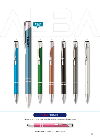 NEW COLOR 48 49 52 66 80 85 91 Alba Touch VŠECHNY BARVY ALBA JSOU NA VYŽÁDÁNÍ TAKÉ VE VARIANTĚ ALBA TOUCH ALBA TOUCH | 1201316-T | 13,90 Kč | 0,57 € 97